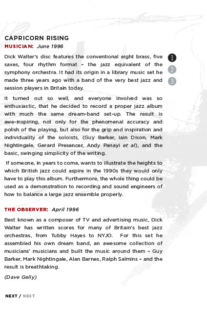 This CD served as my introduction to the talents of saxist-arranger-composer Dick Walter, and a very impressive introduction it proved to be. Each track is a Walter original, and they span a two-decade period, during which modern big band jazz has been at a premium, to say the least. As a jazz composer Dick Walter can stand alongside such worthies as Gerry Mulligan, Bill Russo, Francy Boland, Bob Florence and Bill Holman.